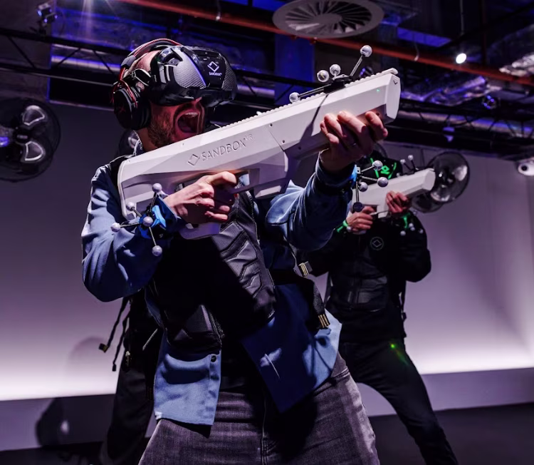 Through wireless VR headsets, haptic vests, full-body trackers, breathtaking visuals, AAA-quality content, and Hollywood-level motion capture, our experiences place you and your group into a hyper-realistic virtual world. Our tracking technology translates every move your body makes into the digital world, where your avatar jumps, walks, waves, and aims when you do.