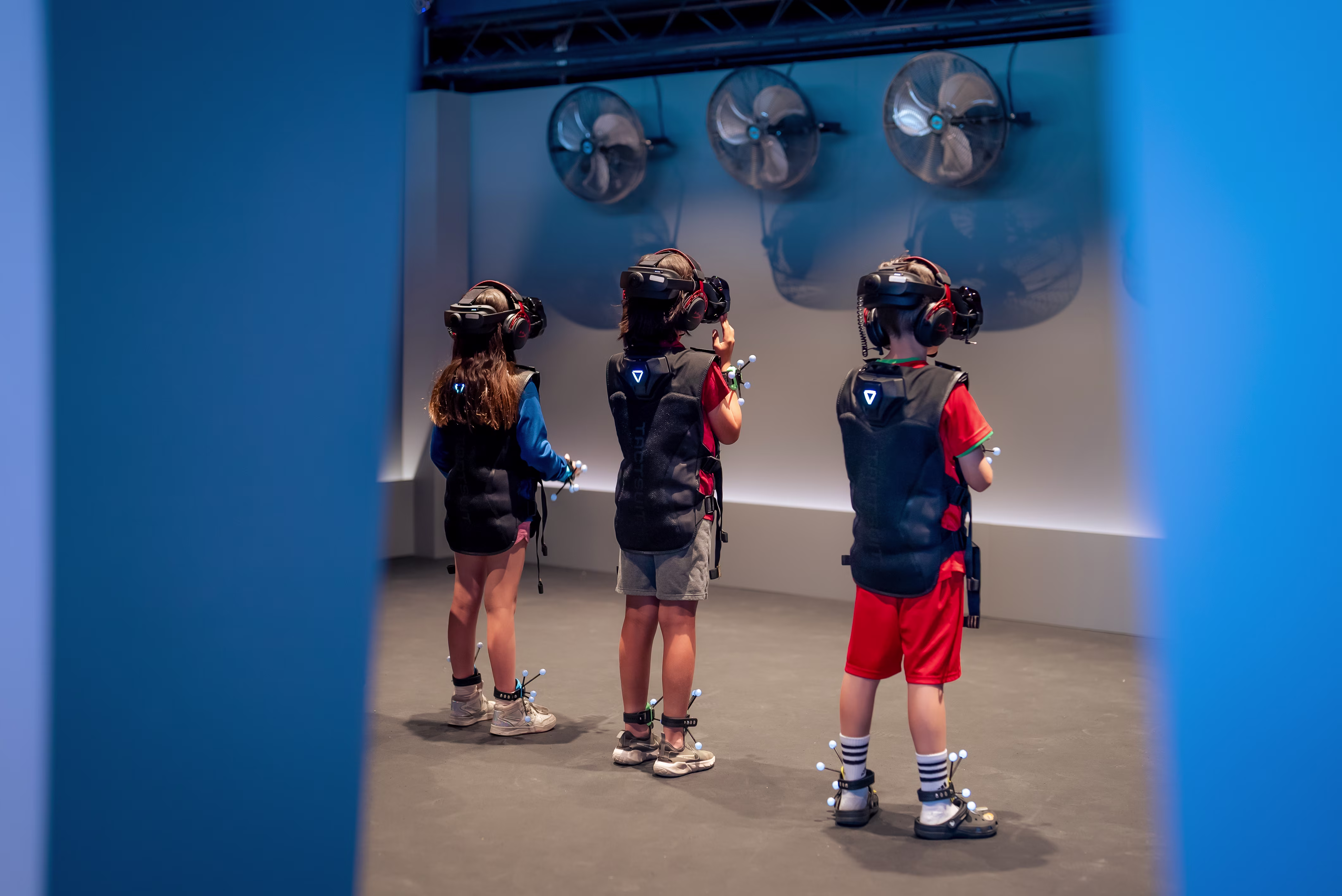 After you check in, we start with a short safety briefing, explaining how the gear works and what to expect during your adventure. Then, you and the kids suit up in lightweight gear that tracks your movements in real time, so your virtual avatar moves exactly as you do.